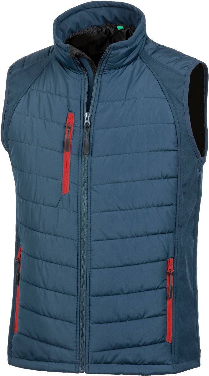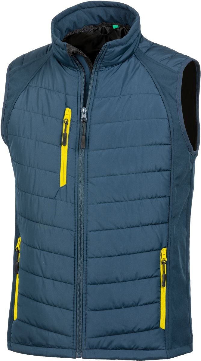 Wasserabweisend, Stehkragen gepolstert, eingefasste Armlöcher, YKK Reißverschluss mit Kinnschutz, Details in Kontrastfarbe an Brust- und Seitentaschen, Veredelungszugang an linker Brust, Aufhänger, Materialmix aus gestepptem wattiertem Polyester und Softshell, wattierter gesteppter Körperbereich, winddicht, Schonwäsche, 40° waschbar, nicht bügeln, nicht trocknergeeignet