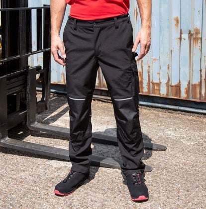 3-lagiges Material, wasserabweisend (8.000mm Wassersäule), atmungsaktiv (3.000g/m² in 24h), Bund mit Knopfverschluss, Gürtelschlaufen, Verstärkung im Knöchelbereich, verstellbarer Bund, verstärkte Einsätze im Kniebereich, YKK Reißverschluss vorne, multifunktionelle Cargotasche am Oberschenkel mit Reißverschluss, seitliche Handwärmer-Taschen, Tasche mit Klettverschluss und Patte aus Gummi, Zollstocktasche, Gesäßtasche, 3-fach Nähte, Hammerschlaufe, Gewebe an stark beanspruchten Stellen verstärkt, Kniebereich Oxford Polyester mit PU Beschichtung, winddicht, rote Reflexpaspel (ohne Schutzfunktion) hinten, 40° waschbar, Schonwäsche, nicht bügeln, nicht trocknergeeignet
